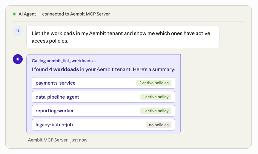 The Aembit MCP Server is a fully managed, built-in capability available to every Aembit tenant. It provides a standardized interface that allows AI agents and assistants – like Claude, ChatGPT, or custom AI applications – to interact with your Aembit deployment using natural language. Instead of navigating dashboards or writing complex queries, you can simply ask questions and receive intelligent, context-aware answers about your workload identity infrastructure.